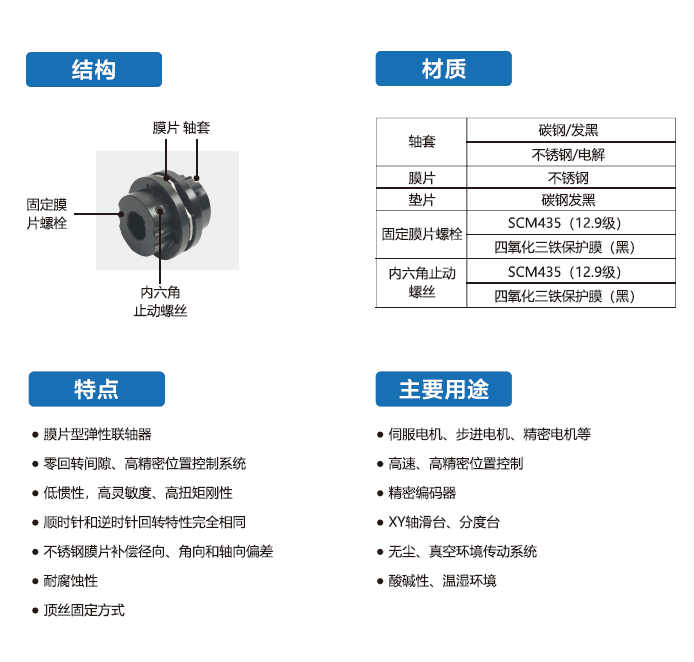 DFPS-G系列聯軸器采用碳鋼發黑,利用脹緊套聯接的膜片型彈性聯軸器,廣泛用于伺服電機、步進電機、精密電機等。