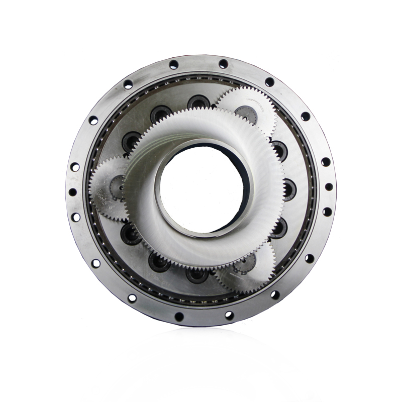 (5)傳遞同樣轉矩與功率時的體積小(或者說單位體積的承載能力大),RV減速器由于第一級用了三個行星輪,特別是第二級,擺線針輪為硬齒面多齒嚙合,這本身就決定了它可以用小的體積傳遞大的轉矩,又加上在結構設計中,讓傳動機構置于行星架的支承主軸承內,使軸向尺寸大大縮小,所有上述因素使傳動總體積大為減小。