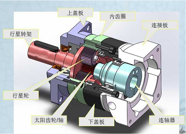 通過行星減速機內部結構圖紙,我們可以看出一臺行星減速機結構包括:連接板、聯軸器、下蓋板、太陽齒輪、行星輪、內齒圈、上蓋板、行星轉架。