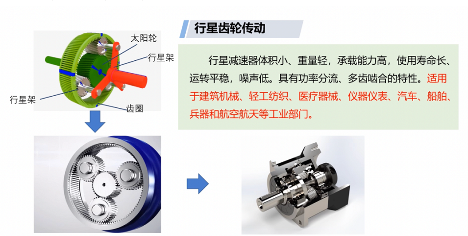 行星減速機(jī),其包括:行星輪、太陽(yáng)輪和外齒圈。行星減速器體積小、重量輕,承載能力高,使用壽命長(zhǎng)、運(yùn)轉(zhuǎn)平穩(wěn),噪聲低。具有功率分流、多齒嚙合的特性。適用于建筑機(jī)械、輕工紡織、醫(yī)療器械、儀器儀表、汽車、船舶和航空航天等領(lǐng)域。