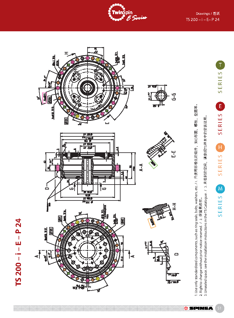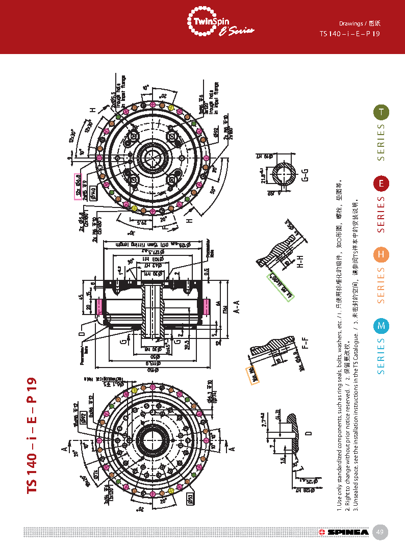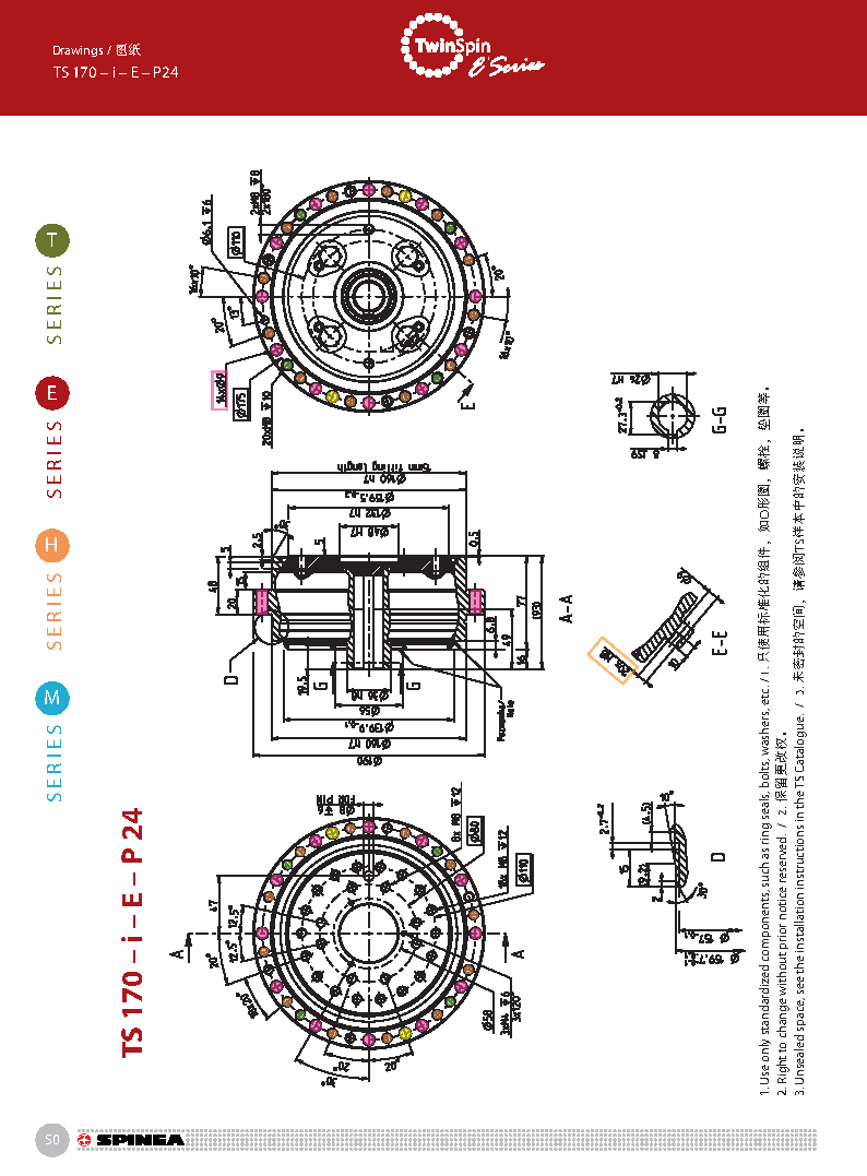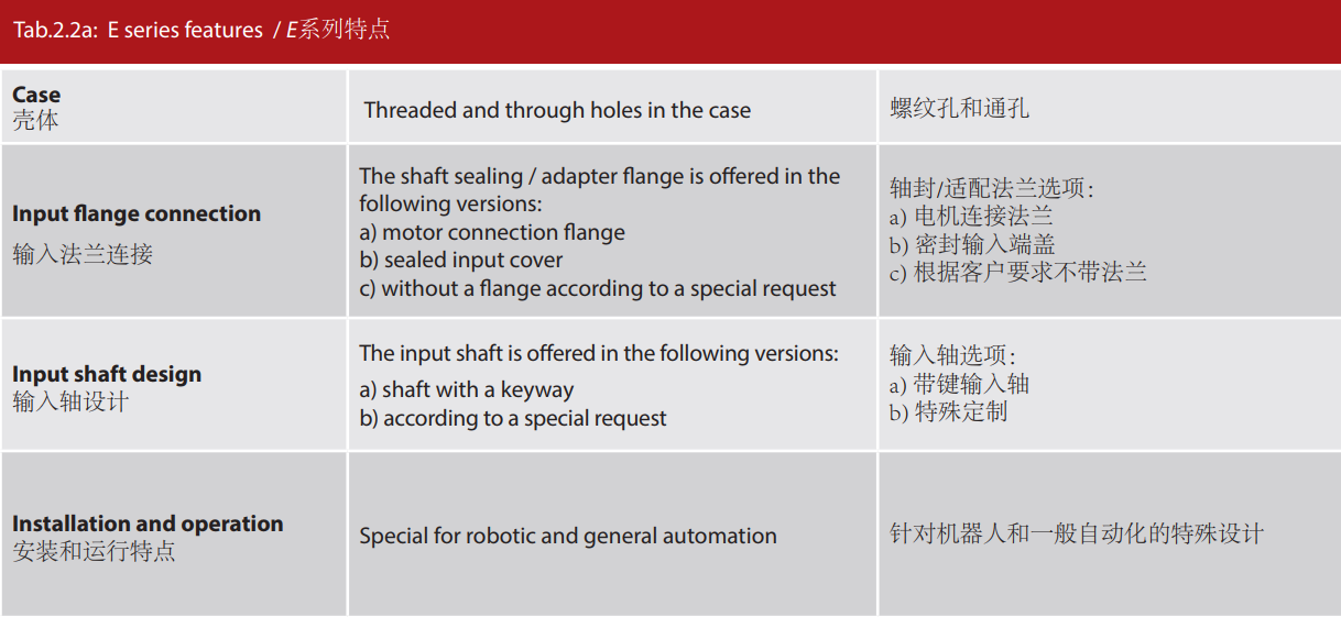 E 系列是帶有法蘭形殼體的Twinspin高精度減速機。 該系列內部包含精密減速機構和高強度交叉滾子軸承,又 名“軸承式減速機”。這種設計可以把負載直接安裝在減 速機輸出法蘭上,省去輸出端的額外軸承。 T系列采用模塊化設計,允許用戶通過電機法蘭的方式連 接各種電機。 標準的T系列減速機為半密封狀態;需要用輸入法蘭和墊 圈密封。SPINEA可根據客戶電機結構提供全密封帶輸入 法蘭的減速機。