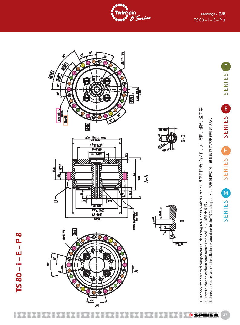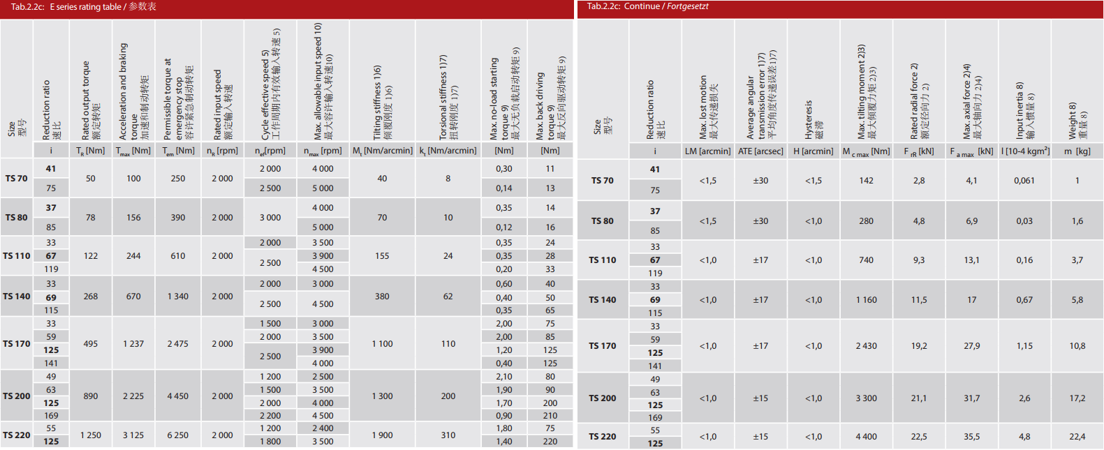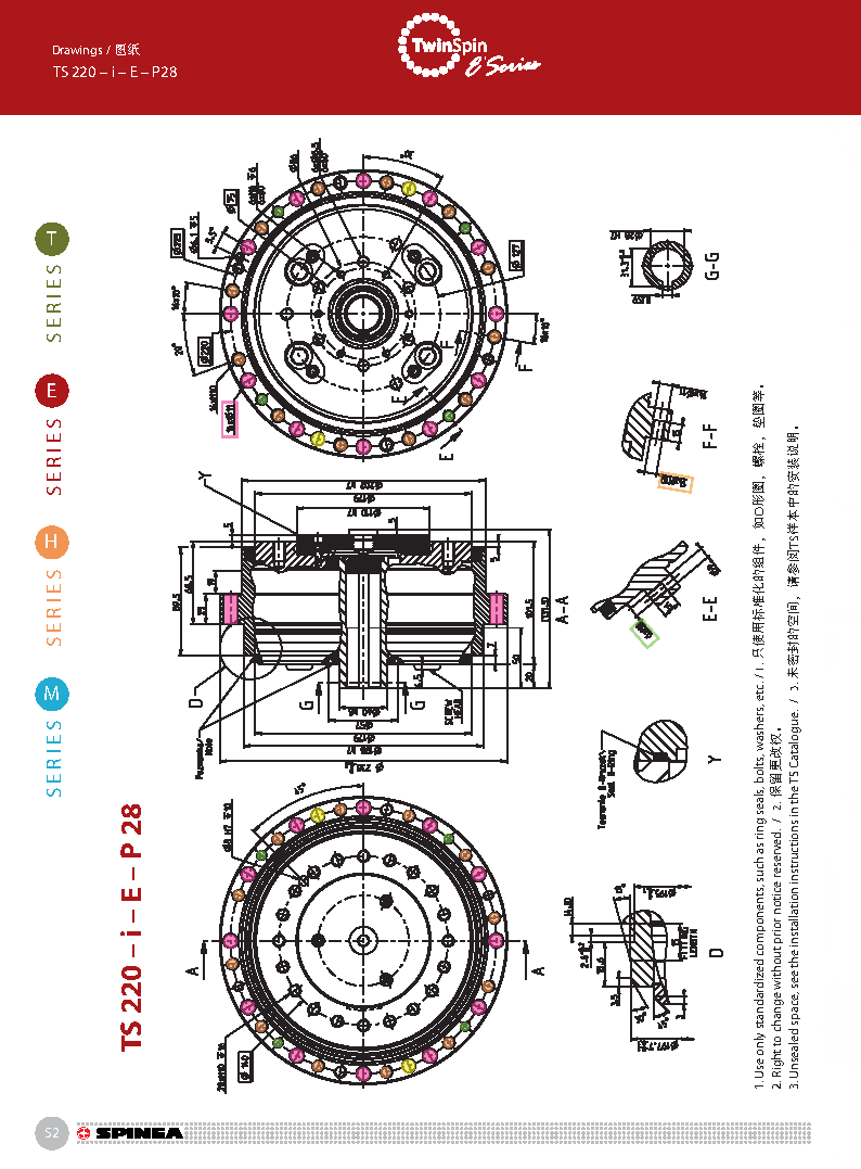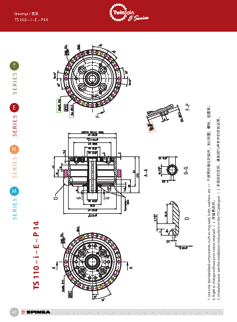 E 系列是帶有法蘭形殼體的Twinspin高精度減速機。 該系列內部包含精密減速機構和高強度交叉滾子軸承,又 名“軸承式減速機”。這種設計可以把負載直接安裝在減 速機輸出法蘭上,省去輸出端的額外軸承。 T系列采用模塊化設計,允許用戶通過電機法蘭的方式連 接各種電機。 標準的T系列減速機為半密封狀態;需要用輸入法蘭和墊 圈密封。SPINEA可根據客戶電機結構提供全密封帶輸入 法蘭的減速機。