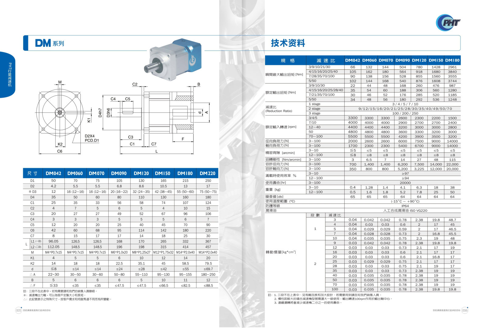 DM 系列是標準型高精度減速機。 品宏減速機的軸承是用NSK品牌的,齒輪經過碳化,故精度和剛性都比較優越!減速機出力軸是可根據客戶的要求去定制大小和長短的。