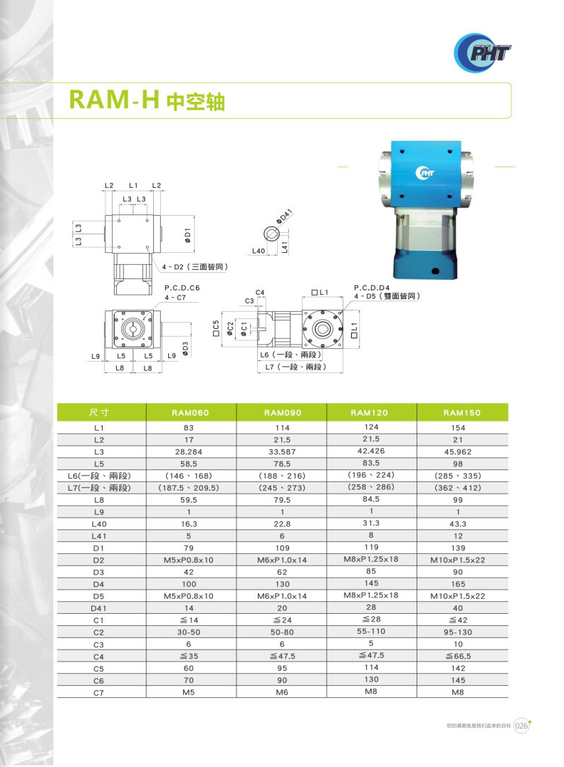 RAM-H系列是中空軸設計。 鋁合金材質可提高散熱能力,減緩溫升現象造成影響。 多樣化的出力軸可因應各種場合,客制化的入力端可搭配各式馬達。 提供各式特色之減速機,供使用者依需求選購。 特殊油封設計,正常使用下不需保養亦不用更換潤滑油,可延長使用壽命。 各式特色,體積小,省空間,噪音低,輸出扭矩高,安裝容易,可搭配馬達型號廣泛。 RAM搭配DM,一體成型的齒輪組,可有效的減低噪音。 RAM搭配DH,最佳的性價比,可廣泛應用于各種場合。