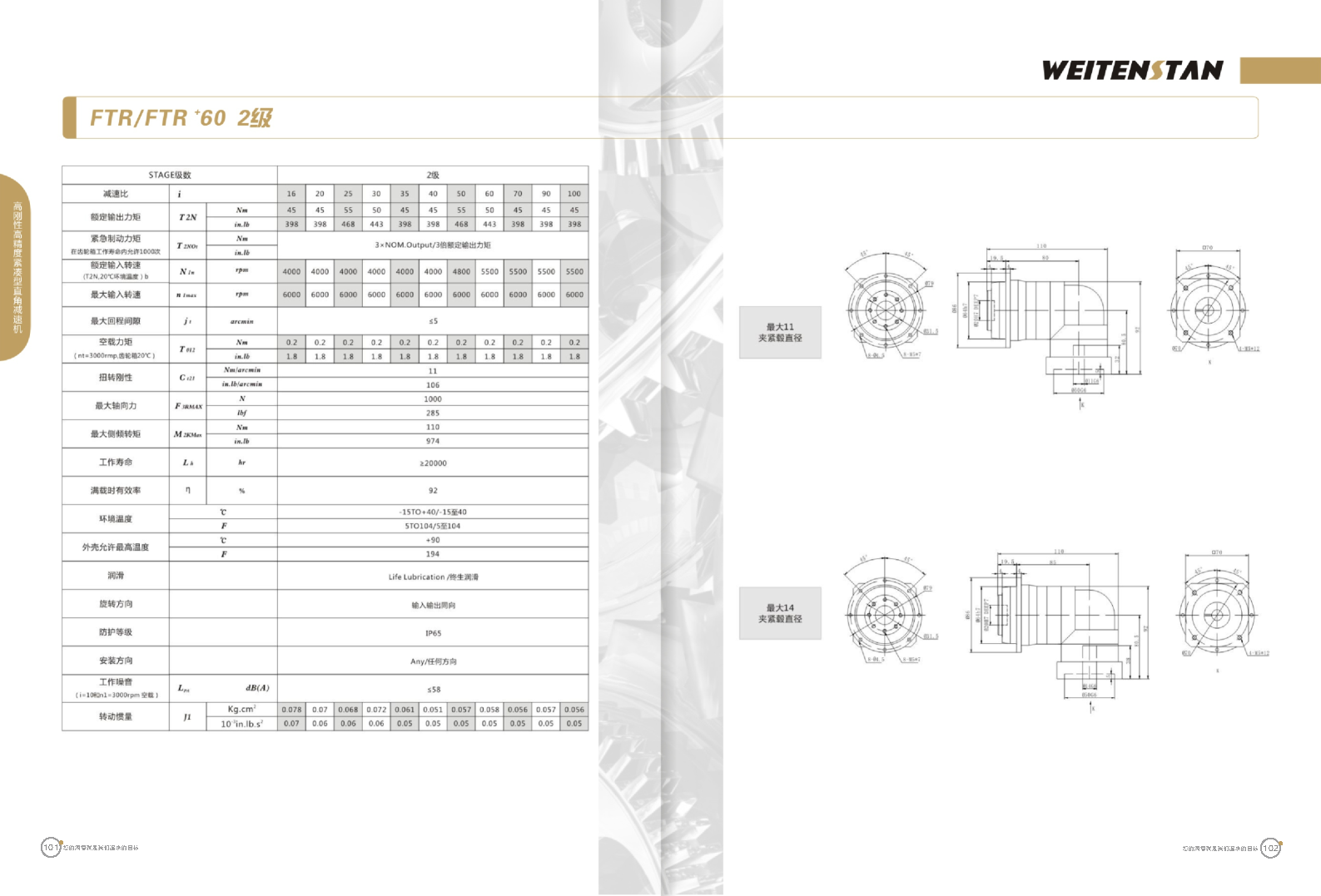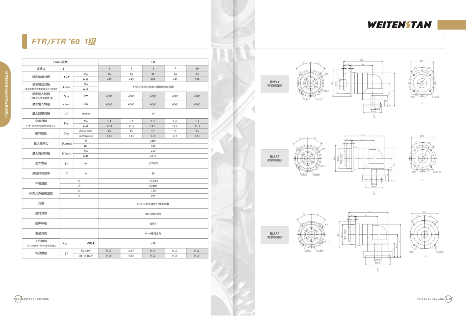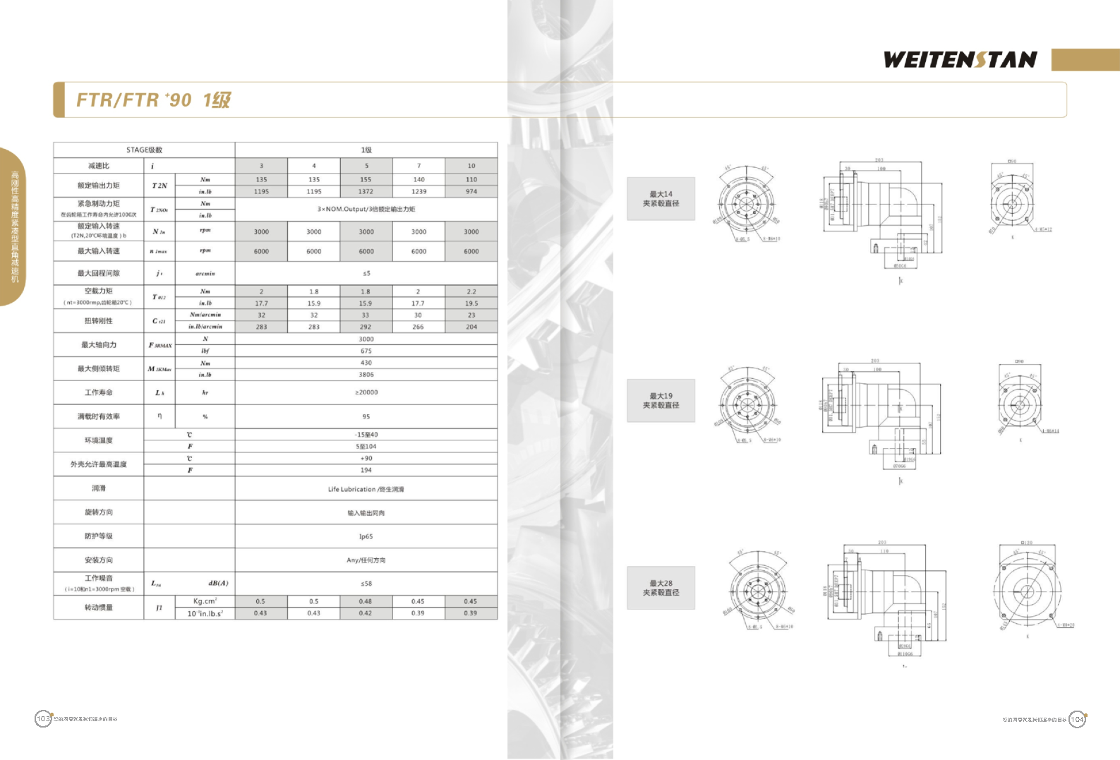 FTR系列高剛性高精度緊湊型直角減速機(jī)。 FTR產(chǎn)品系列的高精度高剛性轉(zhuǎn)角式減速機(jī)。緊湊的結(jié)構(gòu)型和簡單安裝方式。 極高的功率密度。盡管以往系列性能極為出色,但我們成功的將扭矩提高了近40%。不斷提高極限值,典型威騰斯坦產(chǎn)品! 電機(jī)安裝簡易。電機(jī)可安全簡易的一步安裝,另外您也可以選擇威騰斯坦享有的專利權(quán)的,帶有長度補償軸的安裝。 任意位置安裝。不管你在哪個位置安裝,你的齒輪箱始終有相同的潤滑油/潤滑脂量。安裝靈活、齒輪箱能夠垂直、水平、與從動軸一起向上或向下安裝。 極高的定位精度。根據(jù)用戶需求,你可獲得回程間隙小于角分的高型行星齒輪箱。這也大大提高了你應(yīng)用上的定位精度。 通過齒輪嚙合,運轉(zhuǎn)平穩(wěn)。相比直齒嚙合齒輪箱,本公司的斜齒嚙合齒輪箱運轉(zhuǎn)噪音減低了50dB-A,你深知50dB-A所創(chuàng)造的價值遠(yuǎn)遠(yuǎn)高于70dB-A。此外還有:不再感動振動,運轉(zhuǎn)平穩(wěn)到令人驚訝。 世界水平的預(yù)期壽命。原材料進(jìn)行了優(yōu)化,幾何形狀同樣進(jìn)行了優(yōu)化。